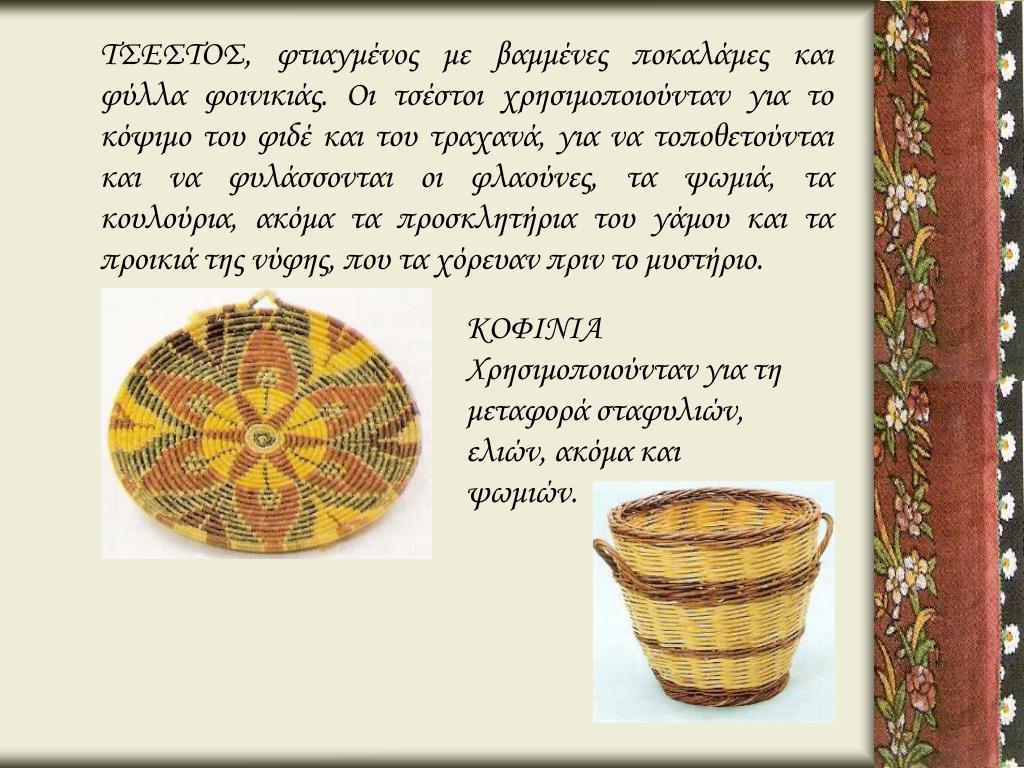 ΤΣΕΣΤΟΣ, φτιαγμένος με βαμμένες ποκαλάμες και φύλλα φοινικιάς. Οι τσέστοι χρησιμοποιούνταν για το κόψιμο του φιδέ και του τραχανά, για να τοποθετούνται και να φυλάσσονται οι φλαούνες, τα ψωμιά, τα κουλούρια, ακόμα τα προσκλητήρια του γάμου και τα προικιά της νύφης, που τα χόρευαν πριν το μυστήριο. ΚΟΦΙΝΙΑ Χρησιμοποιούνταν για τη μεταφορά σταφυλιών, ελιών, ακόμα και ψωμιών.