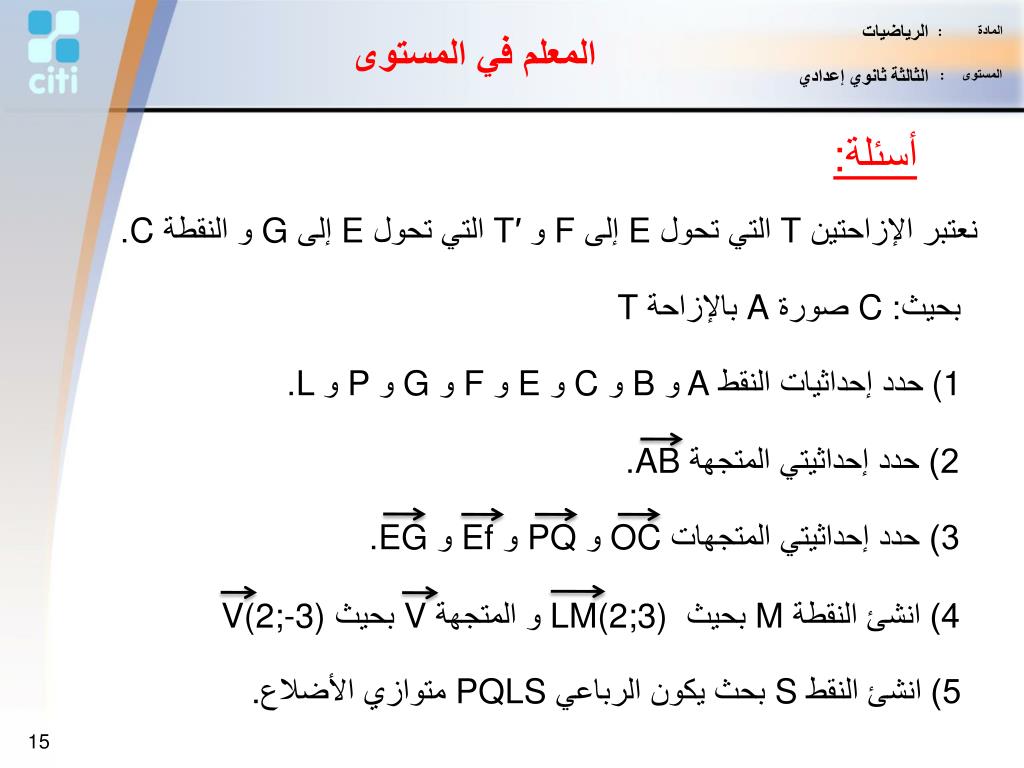 الرياضيات المادة: المعلم في المستوى الثالثة ثانوي إعدادي المستوى: أسئلة: نعتبرالإزاحتين T التي تحول E إلىF وT′التي تحول EإلىG والنقطةC . بحيث:Cصورة A بالإزاحة T 2) حدد إحداثيتي المتجهة AB. حدد إحداثيات النقط AوB و C وE و F و GوP وL . 3) حدد إحداثيتي المتجهات OCو PQ و EfوEG. 4) انشئ النقطة M بحيث LM(2;3) والمتجهة Vبحيث V(2;-3) 5) انشئ النقط S بحث يكون الرباعي PQLS متوازي الأضلاع.