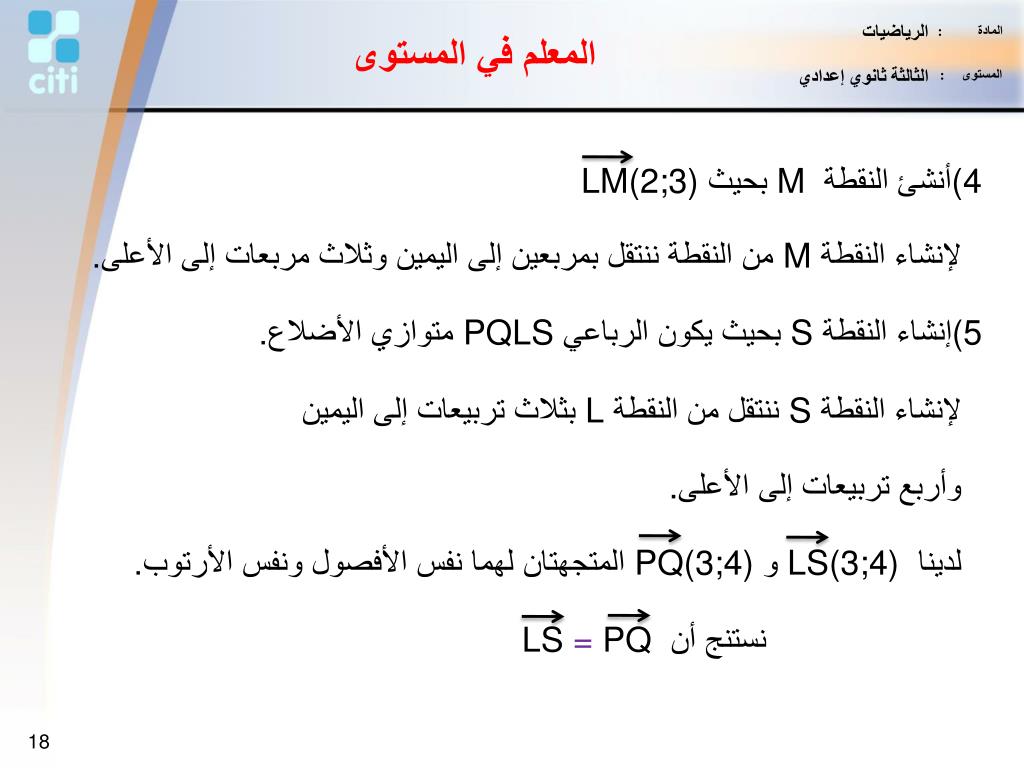 الرياضيات المادة: المعلم في المستوى الثالثة ثانوي إعدادي المستوى: (4أنشئ النقطة M بحيثLM(2;3) لإنشاء النقطةM من النقطة ننتقل بمربعين إلى اليمين وثلاث مربعات إلى الأعلى. (5إنشاء النقطة Sبحيث يكون الرباعي PQLSمتوازي الأضلاع. لإنشاء النقطةS ننتقل من النقطة Lبثلاث تربيعات إلى اليمين وأربع تربيعات إلى الأعلى. لدينا LS(3;4) و PQ(3;4) المتجهتان لهما نفس الأفصول ونفس الأرتوب. نستنج أنLS = PQ