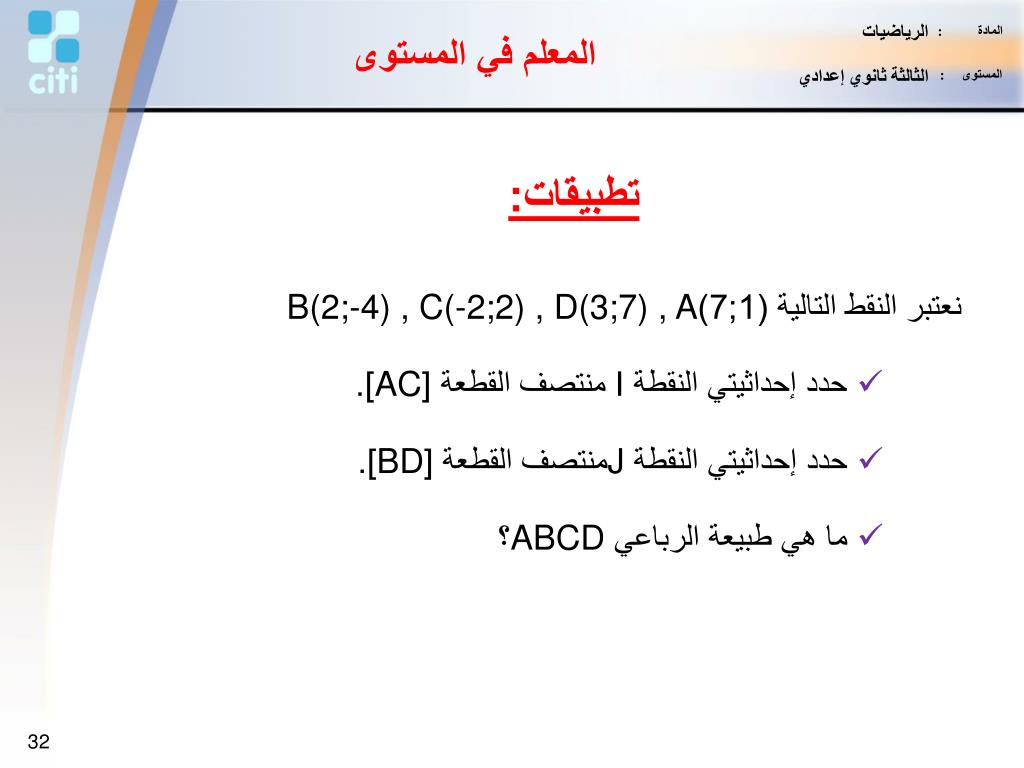 الرياضيات المادة: المعلم في المستوى الثالثة ثانوي إعدادي المستوى: تطبيقات: نعتبر النقط التالية(1;7) B(2;-4) , C(-2;2) , D(3;7) , A • حدد إحداثيتي النقطة I منتصف القطعة [AC]. • حدد إحداثيتي النقطة Jمنتصف القطعة [BD]. • ما هي طبيعة الرباعي ABCD؟