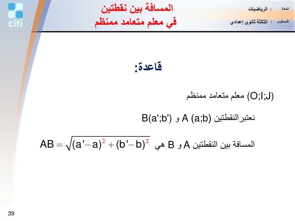 المسافة بين نقطتين في معلم متعامد ممنظم الرياضيات المادة: الثالثة ثانوي إعدادي المستوى: قاعدة: (O;I;J)معلم متعامد ممنظم نعتبرالنقطتين (a;b) A و B(a';b') المسافة بين النقطتين AوB هي