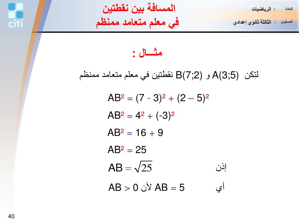 المسافة بين نقطتين في معلم متعامد ممنظم الرياضيات المادة: الثالثة ثانوي إعدادي المستوى: 1- طبيعة المثلثABC مثلث قائم الزاوية في النقطةH لأن(AH)و (BH) مستقيمان متعامدان 2- أفصول النقطة Bهو7 و أفصول النقطة Hهو 3 BH = 7 – 3 = 4 إذن المسافة BH هي أرتوب النقطة A هو 5 وأرتوب النقطة Hهو2 إذن المسافة AH هي AH = 5 – 2 = 3 حسب مبرهنة فيتاغورس المباشرة لدينا AB²= AH²+ BH² أي AB²= 9 + 16 أي AB²= 3²+ 4² AB²= 25 وبالتالي فإن AB = 5