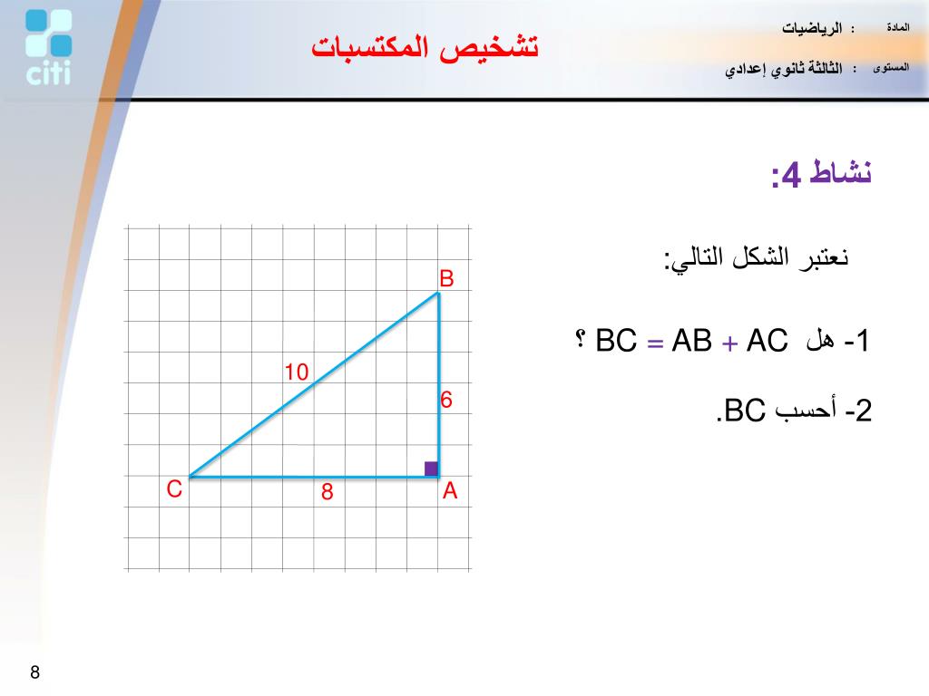 الرياضيات المادة: تشخيصالمكتسبات الثالثة ثانوي إعدادي المستوى: نشاط 4: نعتبر الشكل التالي: B 1- هل BC = AB + AC ؟ 10 6 2- أحسب BC. C A 8