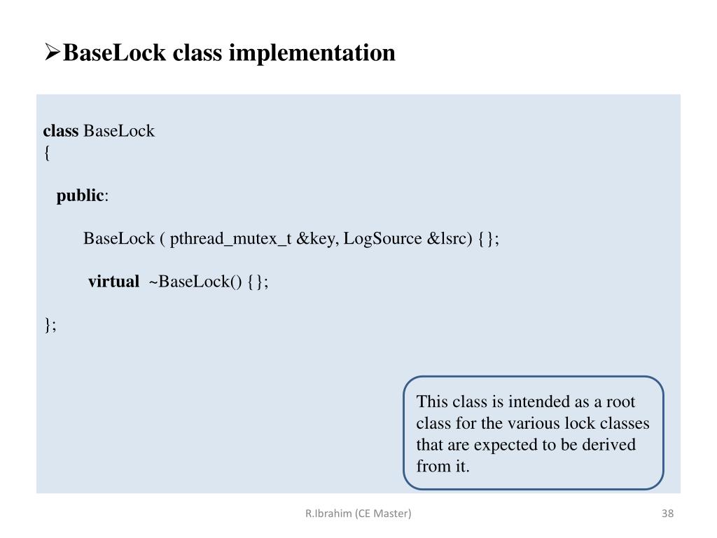 Subclass of BaseLock: MutexLock class implementation LogSource object is meant to capture filename and source code line where the object was constructed. R.Ibrahim (CE Master)