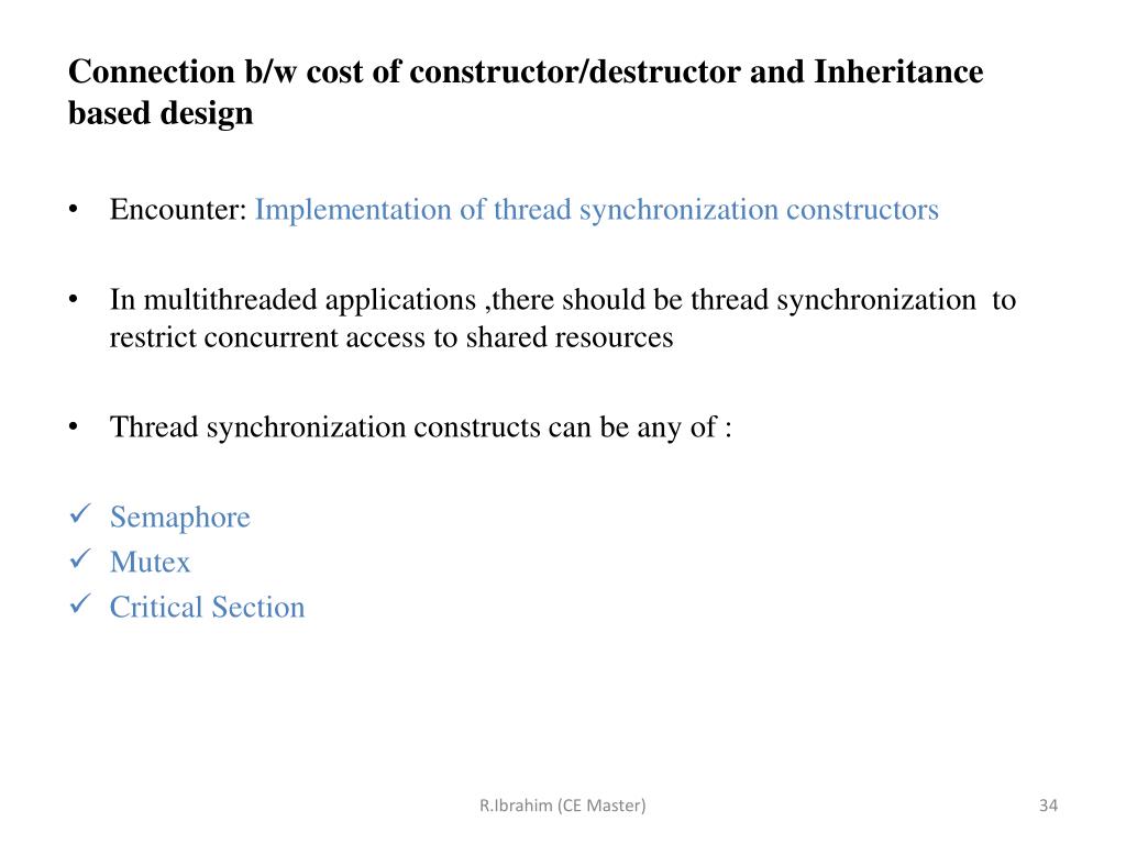 Connection b/w cost of constructor/destructor and Inheritance based design • Encounter: Implementation of thread synchronization constructors • In multithreaded applications ,there should be thread synchronization to restrict concurrent access to shared resources • Thread synchronization constructs can be any of : • Semaphore • Mutex • Critical Section R.Ibrahim (CE Master)