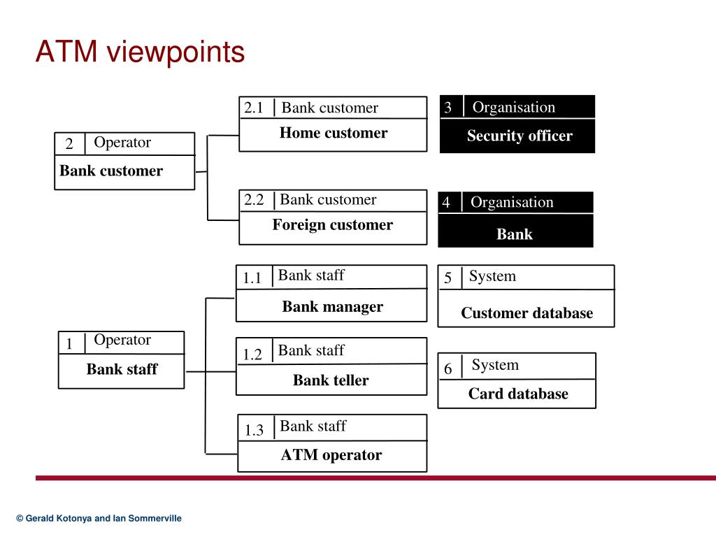 Using abstract viewpoints to identify application specific viewpoints 1. Prune the abstract viewpoint class hierarchy shown in , to eliminate viewpoint classes which are not relevant for the specific system being specified. In the ATM example, let us assume that there is no external certification authority and no environmental effects. We therefore do not need to look for viewpoints under these headings. 2. Consider the system stakeholders i.e. those people who will be affected by the introduction of the system. If these stakeholders fall into classes which are not part the organisational class hierarchy, add these classes to it. 3. Using a model of the system architecture, identify system viewpoints, i.e. viewpoints representing other systems. In the example of the ATM we can identify two main sub-system, the customer database and card database. We note that architectural models of systems almost always exist because new systems must be integrated with existing organisational systems.