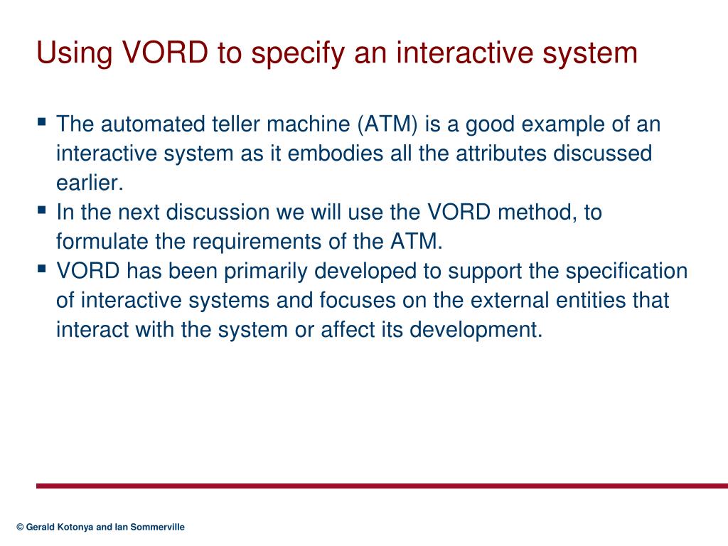 Using VORD to specify an interactive system • The automated teller machine (ATM) is a good example of an interactive system as it embodies all the attributes discussed earlier. • In the next discussion we will use the VORD method, to formulate the requirements of the ATM. • VORD has been primarily developed to support the specification of interactive systems and focuses on the external entities that interact with the system or affect its development.