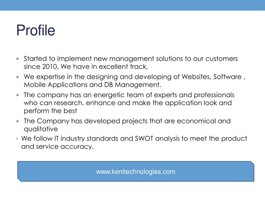 Profile • Started to implement new management solutions to our customers since 2010, We have in excellent track. • We expertise in the designing and developing of Websites, Software , Mobile Applications and DB Management. • The company has an energetic team of experts and professionals who can research, enhance and make the application look and perform the best • The Company has developed projects that are economical and qualitative • We follow IT industry standards and SWOT analysis to meet the product and service accuracy. www.kenitechnologies.com