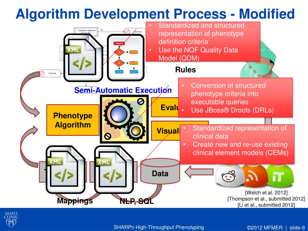 2012 Milestones • Machine learning techniques for algorithm definitions • Online, real-time phenotype execution • Collaboration with NQF, Query Health and i2b2 infrastructures • Use cases and demonstrations • MU quality metrics (w/ NQF, Query Health) • Cohort identification (w/ eMERGE, PGRN) • Value analysis (w/ Mayo CSHCD, REP) • Clinical trial alerting (w/ Mayo Cancer Ctr./CTSA)