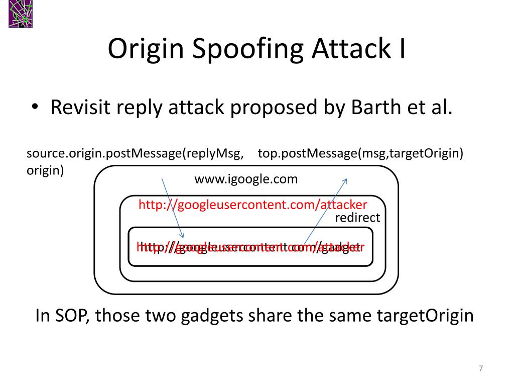 Origin Spoofing Attack I • Revisit reply attack proposed by Barth et al. top.postMessage(msg,targetOrigin) source.origin.postMessage(replyMsg, origin) www.igoogle.com http://googleusercontent.com/attacker redirect http://googleusercontent.com/gadget http://googleusercontent.com/attacker In SOP, those two gadgets share the same targetOrigin