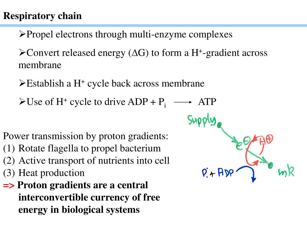 Respiratory chain • Propel electrons through multi-enzyme complexes • Convert released energy (DG) to form a H+-gradient across membrane • Establish a H+ cycle back across membrane • Use of H+ cycle to drive ADP + Pi ATP • Power transmission by proton gradients: • Rotate flagella to propel bacterium • Active transport of nutrients into cell • Heat production • =>Proton gradients are a central interconvertible currency of free energy in biological systems