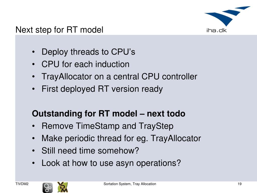Next step for RT model • Deploythreads to CPU’s • CPU for eachinduction • TrayAllocatoron a central CPU controller • Firstdeployed RT version ready Outstanding for RT model – nexttodo • RemoveTimeStamp and TrayStep • Makeperiodicthread for eg. TrayAllocator • Still need time somehow? • Look at how to useasyn operations? Sortation System, Tray Allocation