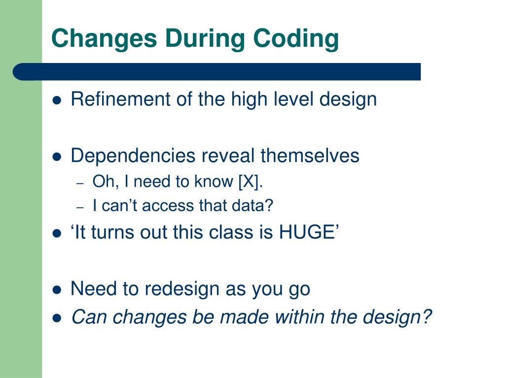 Changes During Coding • Refinement of the high level design • Dependencies reveal themselves • Oh, I need to know [X]. • I can’t access that data? • ‘It turns out this class is HUGE’ • Need to redesign as you go • Can changes be made within the design?
