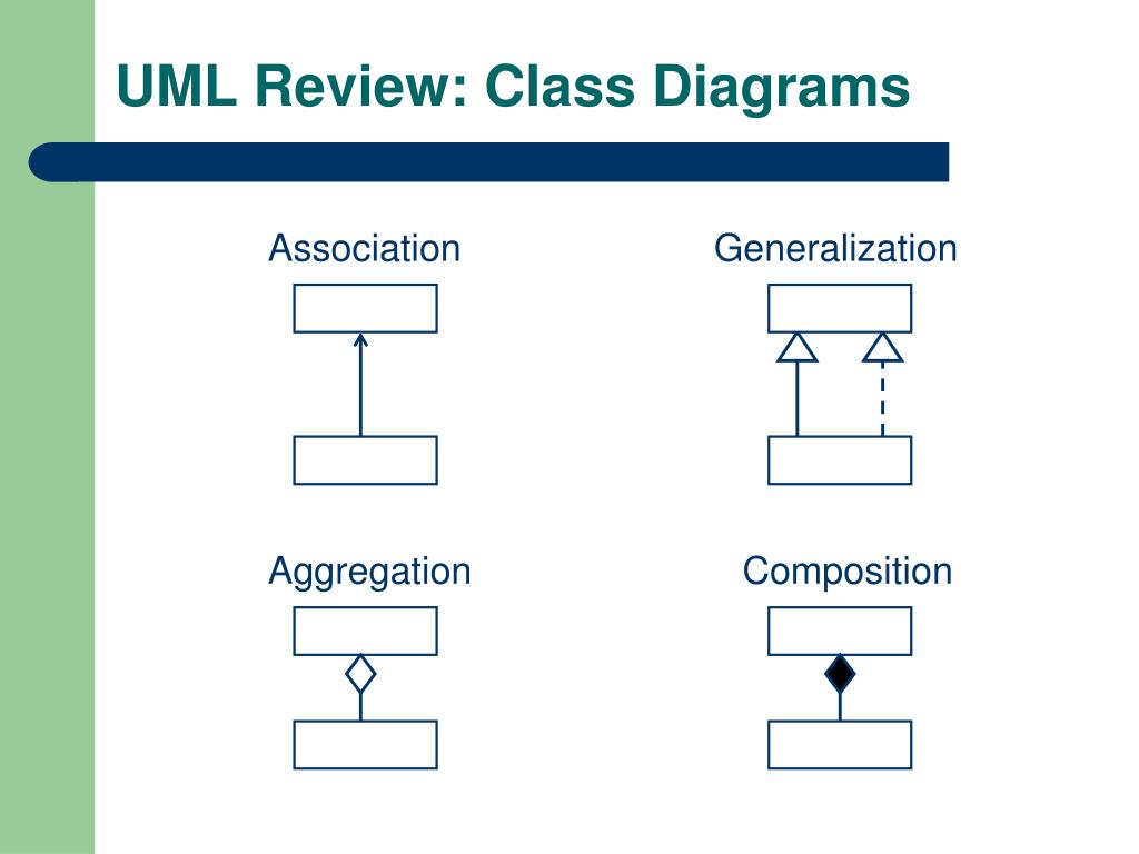 UML Review: Class Diagrams Association Generalization Aggregation Composition