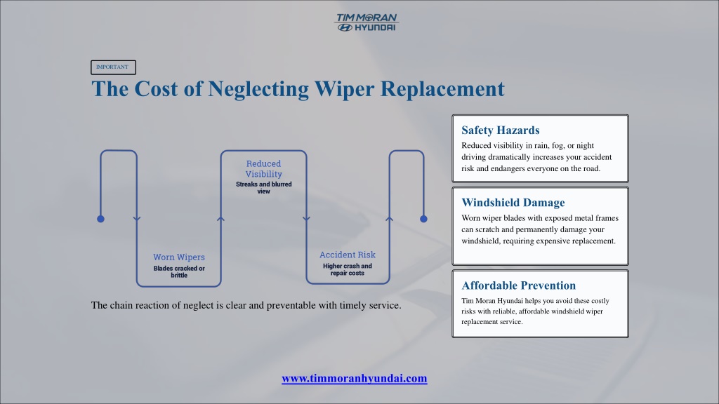 IMPORTANT The Cost of Neglecting Wiper Replacement Safety Hazards Reduced visibility in rain, fog, or night driving dramatically increases your accident risk and endangers everyone on the road. Reduced Visibility Streaks and blurred view Windshield Damage Worn wiper blades with exposed metal frames can scratch and permanently damage your windshield, requiring expensive replacement. Accident Risk Worn Wipers Higher crash and repair costs Blades cracked or brittle Affordable Prevention Tim Moran Hyundai helps you avoid these costly risks with reliable, affordable windshield wiper replacement service. The chain reaction of neglect is clear and preventable with timely service. www.timmoranhyundai.com