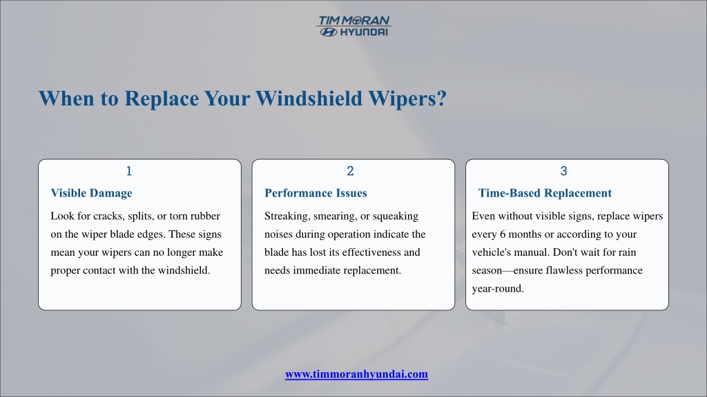 When to Replace Your Windshield Wipers? 1 2 3 Visible Damage Performance Issues Time-Based Replacement Look for cracks, splits, or torn rubber on the wiper blade edges. These signs mean your wipers can no longer make proper contact with the windshield. Streaking, smearing, or squeaking noises during operation indicate the blade has lost its effectiveness and needs immediate replacement. Even without visible signs, replace wipers every 6 months or according to your vehicle's manual. Don't wait for rain season—ensure flawless performance year-round. www.timmoranhyundai.com