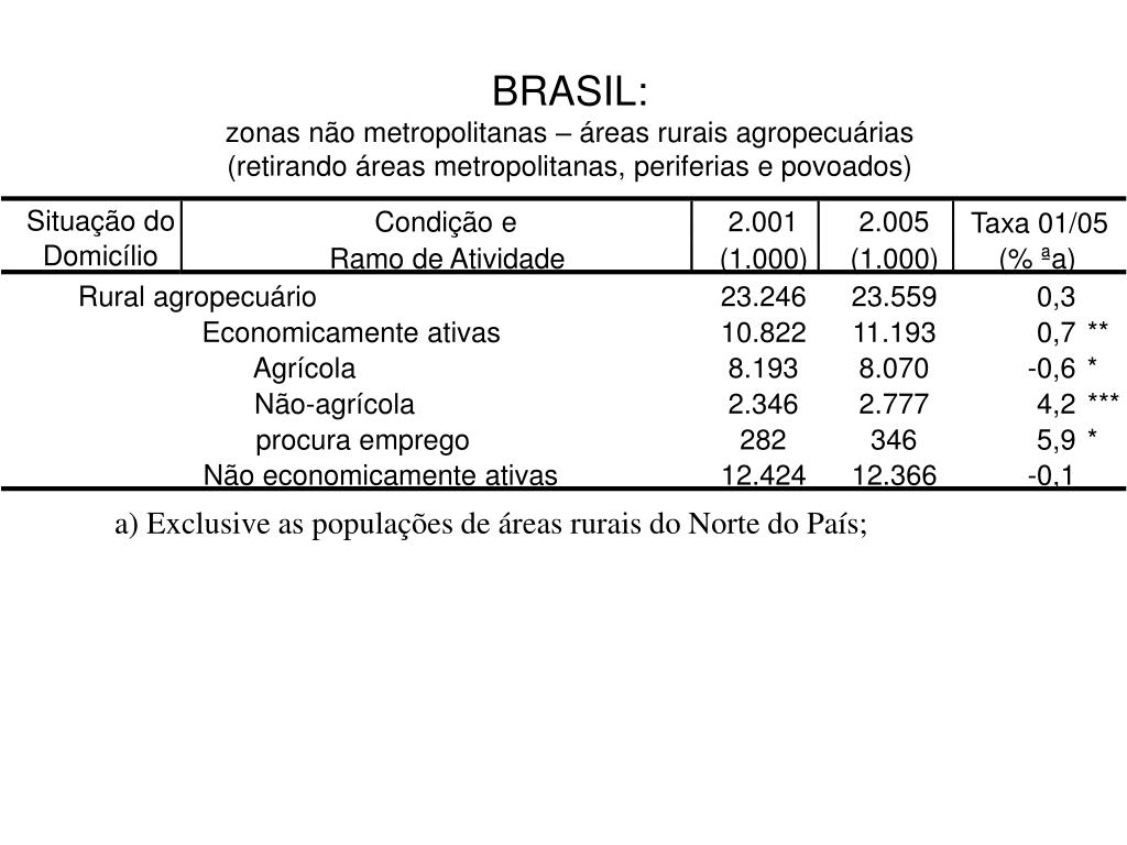 BRASIL: zonas não metropolitanas – áreas rurais agropecuárias (retirando áreas metropolitanas, periferias e povoados) Situação do 2.001 2.005 Condição e Taxa 01/05 Domicílio Ramo de Atividade (1.000) (1.000) (% ªa) Rural agropecuário 23.246 23.559 0,3 Economicamente ativas 10.822 11.193 0,7 ** Agrícola 8.193 8.070 -0,6 * Não-agrícola 2.346 2.777 4,2 *** procura emprego 282 346 5,9 * Não economicamente ativas 12.424 12.366 -0,1 a) Exclusive as populações de áreas rurais do Norte do País;