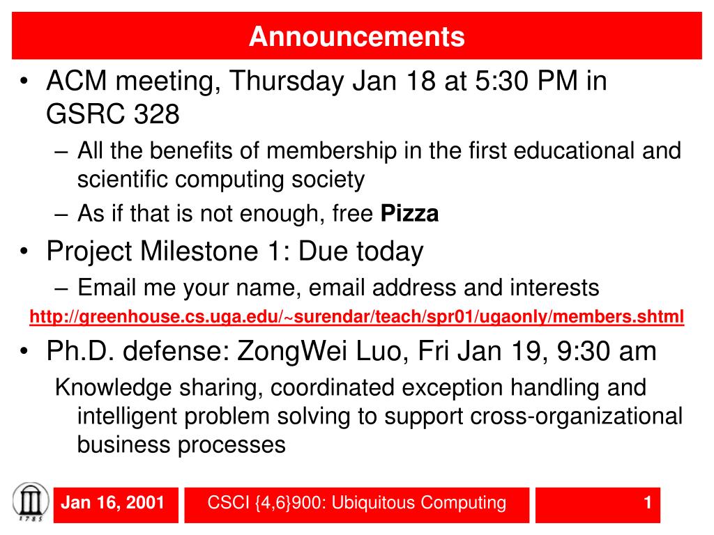 Announcements • ACM meeting, Thursday Jan 18 at 5:30 PM in GSRC 328 • All the benefits of membership in the first educational and scientific computing society • As if that is not enough, free Pizza • Project Milestone 1: Due today • Email me your name, email address and interests http://greenhouse.cs.uga.edu/~surendar/teach/spr01/ugaonly/members.shtml • Ph.D. defense: ZongWei Luo, Fri Jan 19, 9:30 am Knowledge sharing, coordinated exception handling and intelligent problem solving to support cross-organizational business processes CSCI {4,6}900: Ubiquitous Computing