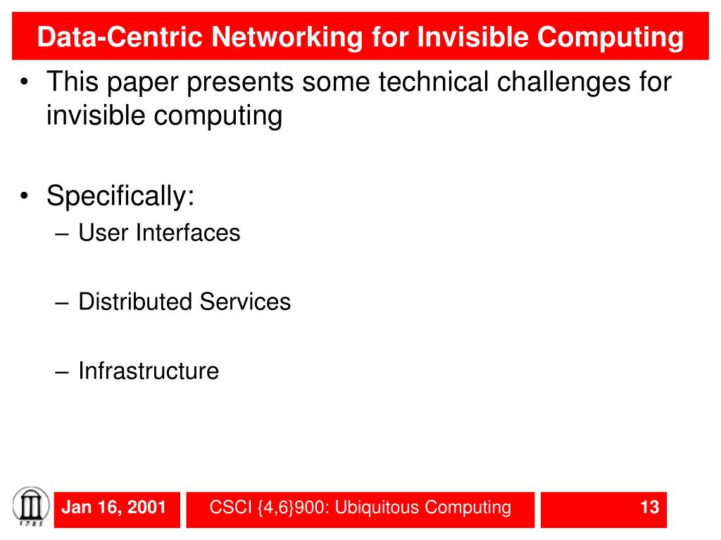 Data-Centric Networking for Invisible Computing • This paper presents some technical challenges for invisible computing • Specifically: • User Interfaces • Distributed Services • Infrastructure CSCI {4,6}900: Ubiquitous Computing