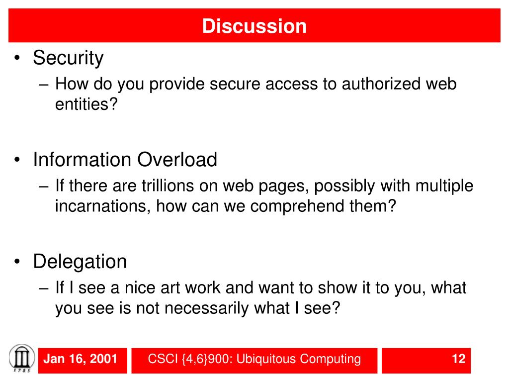 Discussion • Security • How do you provide secure access to authorized web entities? • Information Overload • If there are trillions on web pages, possibly with multiple incarnations, how can we comprehend them? • Delegation • If I see a nice art work and want to show it to you, what you see is not necessarily what I see? CSCI {4,6}900: Ubiquitous Computing