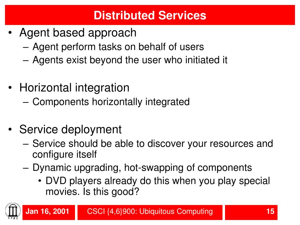 Distributed Services • Agent based approach • Agent perform tasks on behalf of users • Agents exist beyond the user who initiated it • Horizontal integration • Components horizontally integrated • Service deployment • Service should be able to discover your resources and configure itself • Dynamic upgrading, hot-swapping of components • DVD players already do this when you play special movies. Is this good? CSCI {4,6}900: Ubiquitous Computing