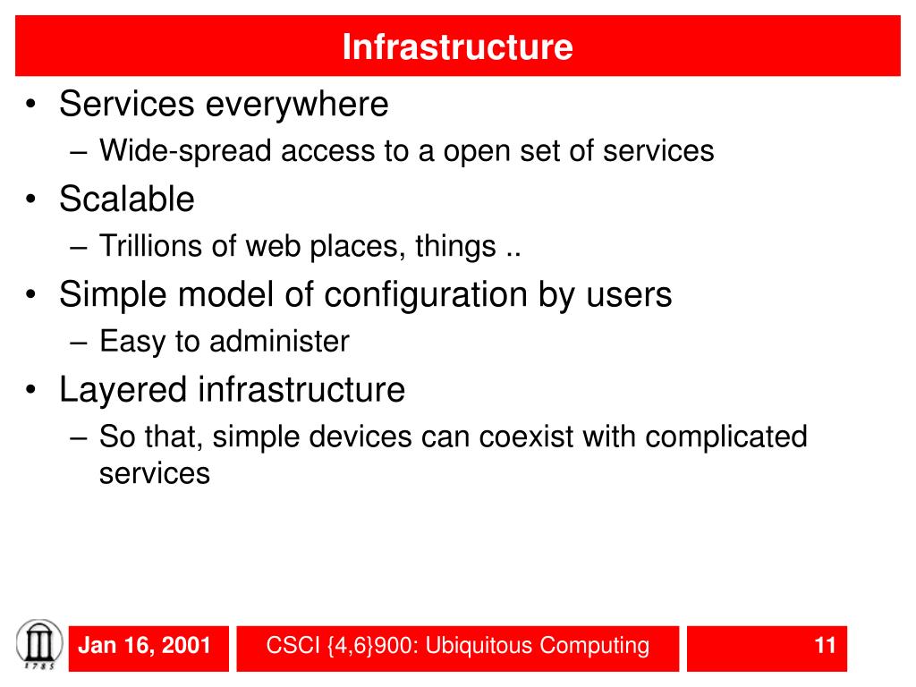 Infrastructure • Services everywhere • Wide-spread access to a open set of services • Scalable • Trillions of web places, things .. • Simple model of configuration by users • Easy to administer • Layered infrastructure • So that, simple devices can coexist with complicated services CSCI {4,6}900: Ubiquitous Computing
