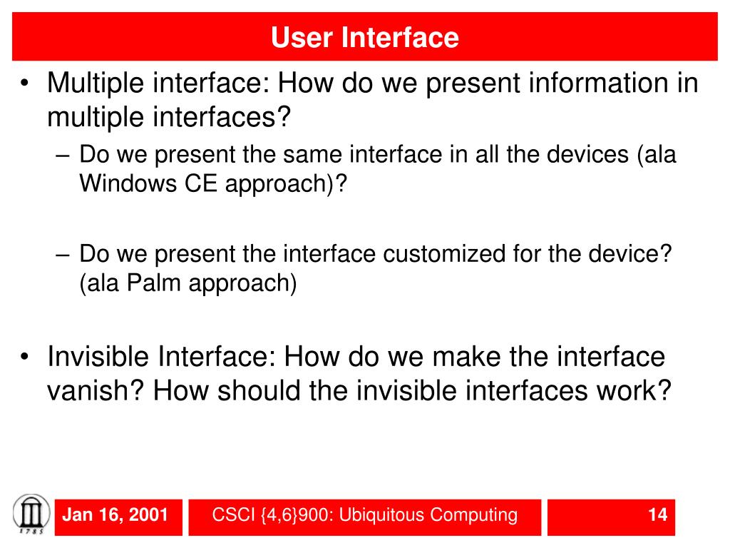 User Interface • Multiple interface: How do we present information in multiple interfaces? • Do we present the same interface in all the devices (ala Windows CE approach)? • Do we present the interface customized for the device? (ala Palm approach) • Invisible Interface: How do we make the interface vanish? How should the invisible interfaces work? CSCI {4,6}900: Ubiquitous Computing