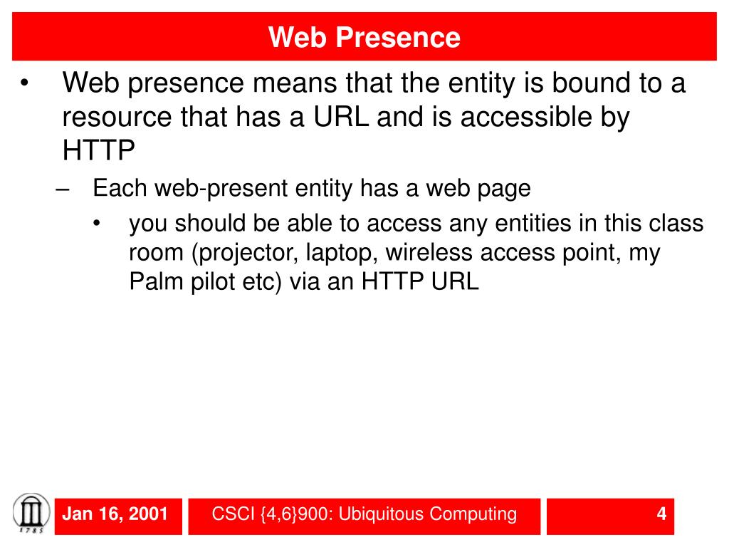 Web Presence • Web presence means that the entity is bound to a resource that has a URL and is accessible by HTTP • Each web-present entity has a web page • you should be able to access any entities in this class room (projector, laptop, wireless access point, my Palm pilot etc) via an HTTP URL CSCI {4,6}900: Ubiquitous Computing
