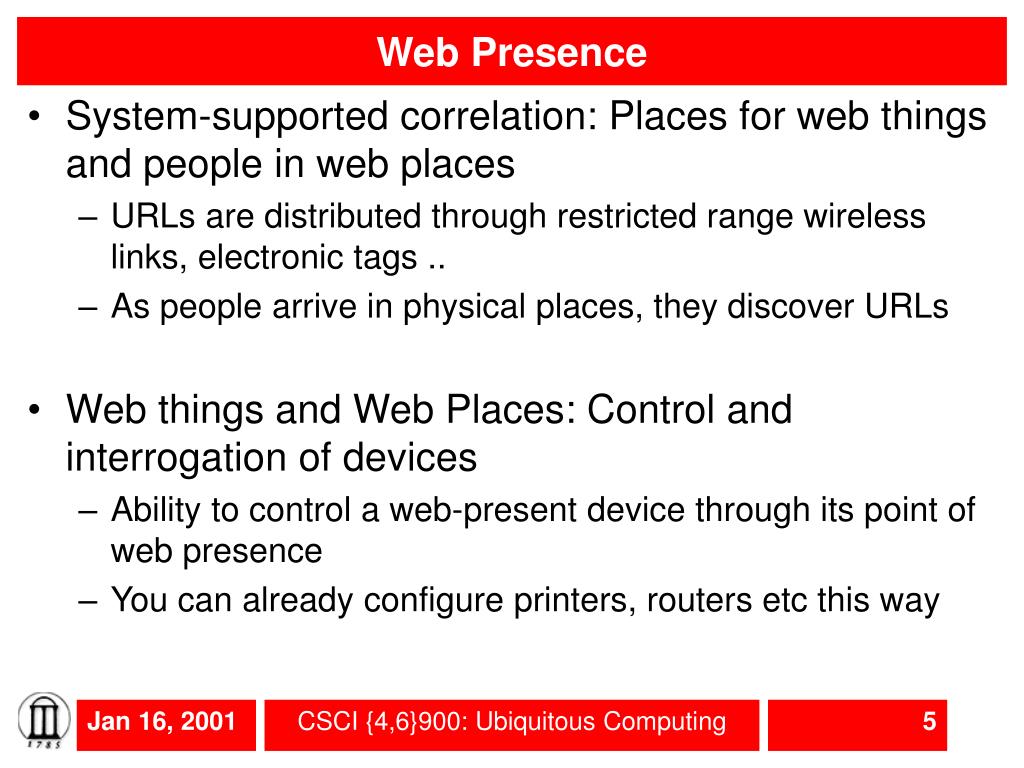 Web Presence • System-supported correlation: Places for web things and people in web places • URLs are distributed through restricted range wireless links, electronic tags .. • As people arrive in physical places, they discover URLs • Web things and Web Places: Control and interrogation of devices • Ability to control a web-present device through its point of web presence • You can already configure printers, routers etc this way CSCI {4,6}900: Ubiquitous Computing