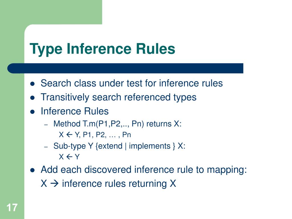 Type Inference Rules • Search class under test for inference rules • Transitively search referenced types • Inference Rules • Method T.m(P1,P2,.., Pn) returns X: X Y, P1, P2, … , Pn • Sub-type Y {extend | implements } X: X Y • Add each discovered inference rule to mapping: X inference rules returning X