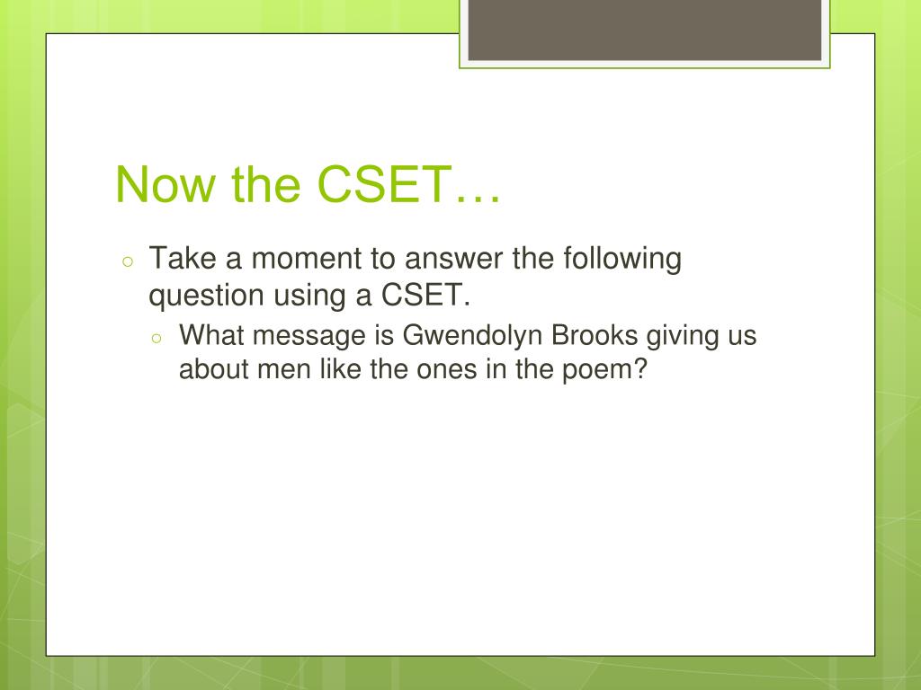 Now the CSET… • Take a moment to answer the following question using a CSET. • What message is Gwendolyn Brooks giving us about men like the ones in the poem?