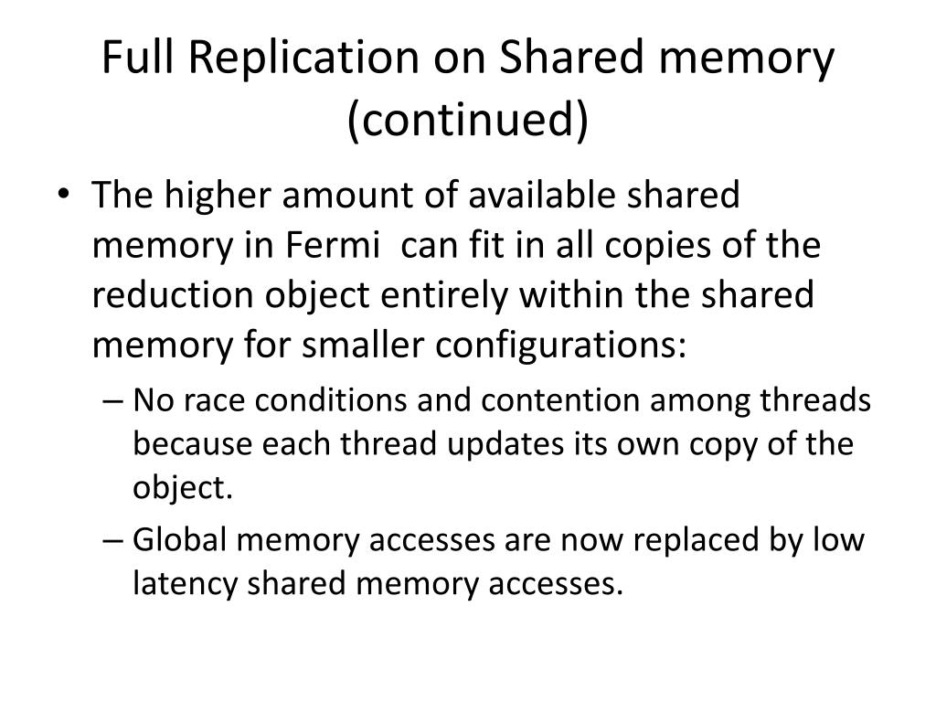 Full Replication on Shared memory (continued) • The higher amount of available shared memory in Fermi can fit in all copies of the reduction object entirely within the shared memory for smaller configurations: • No race conditions and contention among threads because each thread updates its own copy of the object. • Global memory accesses are now replaced by low latency shared memory accesses.