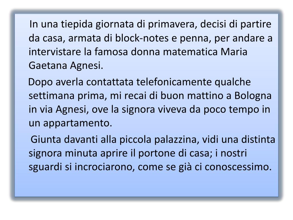 In una tiepida giornata di primavera, decisi di partire da casa, armata di block-notes e penna, per andare a intervistare la famosa donna matematica Maria Gaetana Agnesi. Dopo averla contattata telefonicamente qualche settimana prima, mi recai di buon mattino a Bologna in via Agnesi, ove la signora viveva da poco tempo in un appartamento. Giunta davanti alla piccola palazzina, vidi una distinta signora minuta aprire il portone di casa; i nostri sguardi si incrociarono, come se già ci conoscessimo.