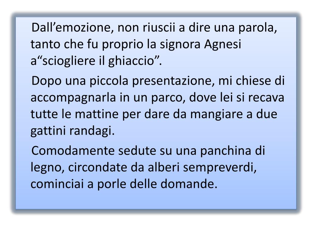 Dall’emozione, non riuscii a dire una parola, tanto che fu proprio la signora Agnesi a“sciogliere il ghiaccio”. Dopo una piccola presentazione, mi chiese di accompagnarla in un parco, dove lei si recava tutte le mattine per dare da mangiare a due gattini randagi. Comodamente sedute su una panchina di legno, circondate da alberi sempreverdi, cominciai a porle delle domande.