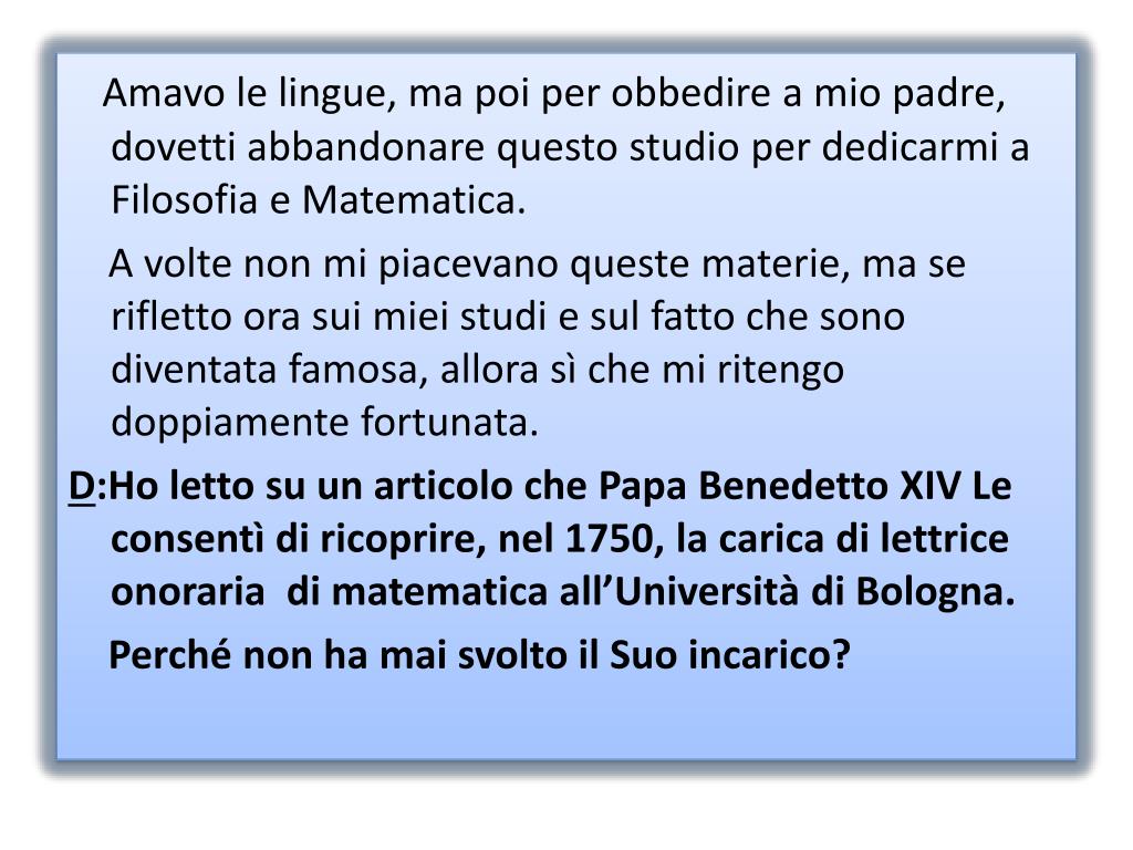 Amavo le lingue, ma poi per obbedire a mio padre, dovetti abbandonare questo studio per dedicarmi a Filosofia e Matematica. A volte non mi piacevano queste materie, ma se rifletto ora sui miei studi e sul fatto che sono diventata famosa, allora sì che mi ritengo doppiamente fortunata. D:Ho letto su un articolo che Papa Benedetto XIV Le consentì di ricoprire, nel 1750, la carica di lettrice onoraria di matematica all’Università di Bologna. Perché non ha mai svolto il Suo incarico?