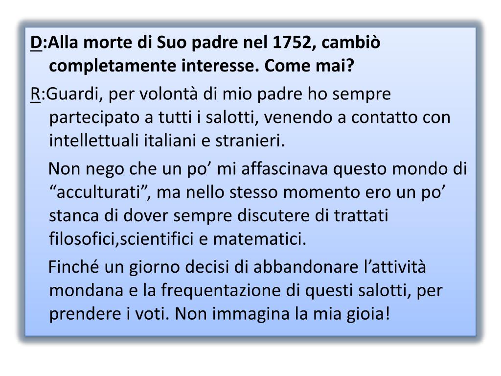 D:Alla morte di Suo padre nel 1752, cambiò completamente interesse. Come mai? R:Guardi, per volontà di mio padre ho sempre partecipato a tutti i salotti, venendo a contatto con intellettuali italiani e stranieri. Non nego che un po’ mi affascinava questo mondo di “acculturati”, ma nello stesso momento ero un po’ stanca di dover sempre discutere di trattati filosofici,scientifici e matematici. Finché un giorno decisi di abbandonare l’attività mondana e la frequentazione di questi salotti, per prendere i voti. Non immagina la mia gioia!