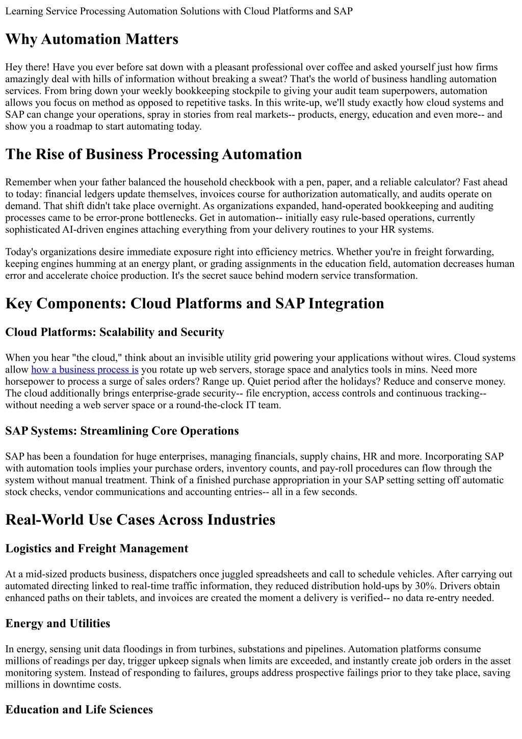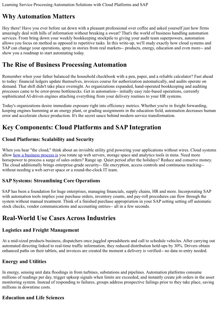 Learning Service Processing Automation Solutions with Cloud Platforms and SAP Why Automation Matters Hey there! Have you ever before sat down with a pleasant professional over coffee and asked yourself just how firms amazingly deal with hills of information without breaking a sweat? That's the world of business handling automation services. From bring down your weekly bookkeeping stockpile to giving your audit team superpowers, automation allows you focus on method as opposed to repetitive tasks. In this write-up, we'll study exactly how cloud systems and SAP can change your operations, spray in stories from real markets-- products, energy, education and even more-- and show you a roadmap to start automating today. The Rise of Business Processing Automation Remember when your father balanced the household checkbook with a pen, paper, and a reliable calculator? Fast ahead to today: financial ledgers update themselves, invoices course for authorization automatically, and audits operate on demand. That shift didn't take place overnight. As organizations expanded, hand-operated bookkeeping and auditing processes came to be error-prone bottlenecks. Get in automation-- initially easy rule-based operations, currently sophisticated AI-driven engines attaching everything from your delivery routines to your HR systems. Today's organizations desire immediate exposure right into efficiency metrics. Whether you're in freight forwarding, keeping engines humming at an energy plant, or grading assignments in the education field, automation decreases human error and accelerate choice production. It's the secret sauce behind modern service transformation. Key Components: Cloud Platforms and SAP Integration Cloud Platforms: Scalability and Security When you hear "the cloud," think about an invisible utility grid powering your applications without wires. Cloud systems allow how a business process is you rotate up web servers, storage space and analytics tools in mins. Need more horsepower to process a surge of sales orders? Range up. Quiet period after the holidays? Reduce and conserve money. The cloud additionally brings enterprise-grade security-- file encryption, access controls and continuous tracking-- without needing a web server space or a round-the-clock IT team. SAP Systems: Streamlining Core Operations SAP has been a foundation for huge enterprises, managing financials, supply chains, HR and more. Incorporating SAP with automation tools implies your purchase orders, inventory counts, and pay-roll procedures can flow through the system without manual treatment. Think of a finished purchase appropriation in your SAP setting setting off automatic stock checks, vendor communications and accounting entries-- all in a few seconds. Real-World Use Cases Across Industries Logistics and Freight Management At a mid-sized products business, dispatchers once juggled spreadsheets and call to schedule vehicles. After carrying out automated directing linked to real-time traffic information, they reduced distribution hold-ups by 30%. Drivers obtain enhanced paths on their tablets, and invoices are created the moment a delivery is verified-- no data re‐entry needed. Energy and Utilities In energy, sensing unit data floodings in from turbines, substations and pipelines. Automation platforms consume millions of readings per day, trigger upkeep signals when limits are exceeded, and instantly create job orders in the asset monitoring system. Instead of responding to failures, groups address prospective failings prior to they take place, saving millions in downtime costs. Education and Life Sciences
