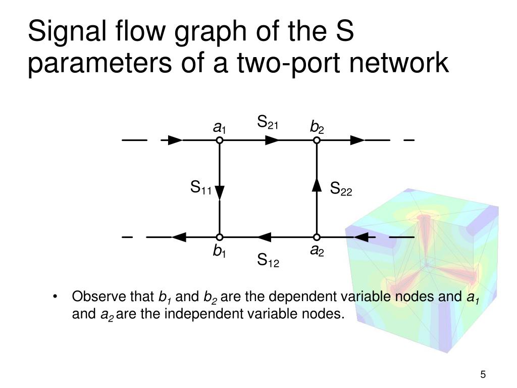 Signal flow graph of the S parameters of a two-port network • Observe that b1and b2are the dependent variable nodes and a1 and a2 are the independent variable nodes.