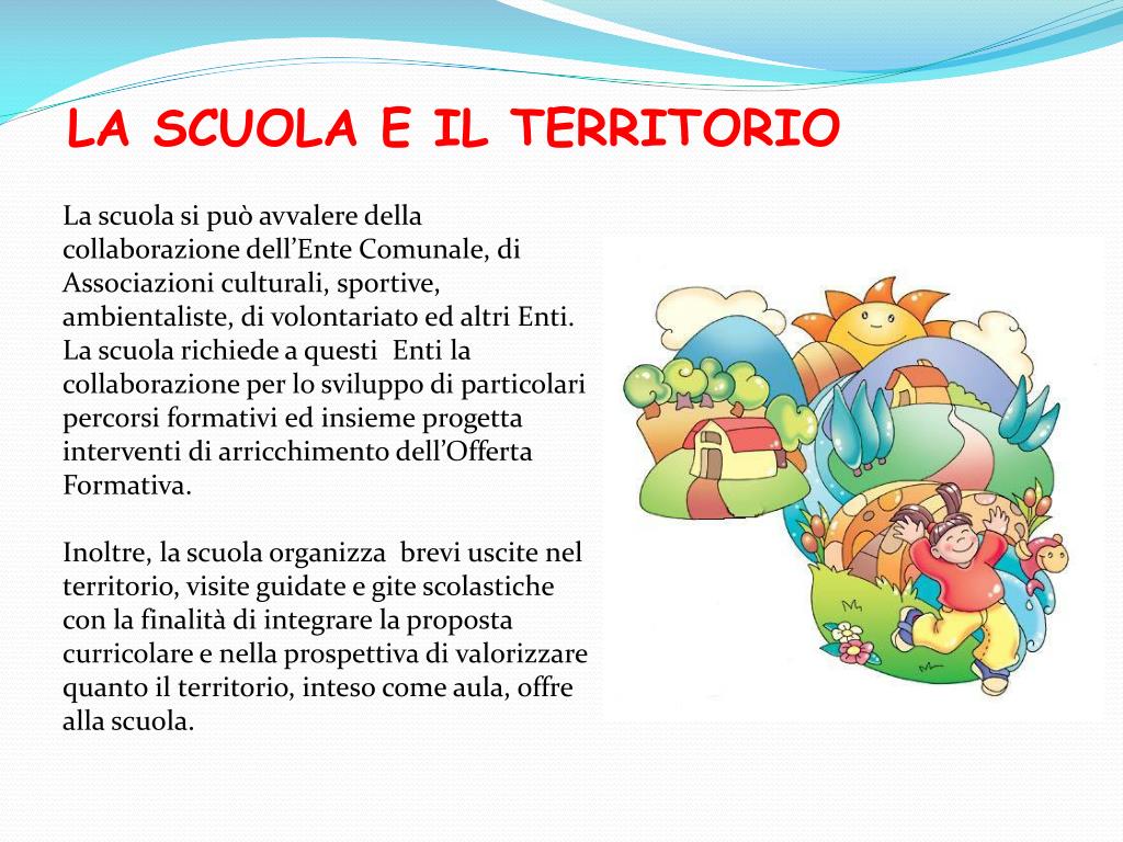 LA SCUOLA E IL TERRITORIO La scuolasipuòavvaleredellacollaborazionedell’EnteComunale, di Associazioniculturali, sportive, ambientaliste, di volontariatoedaltriEnti. La scuolarichiede a questiEnti la collaborazione per lo sviluppodiparticolaripercorsiformativiedinsiemeprogettainterventidiarricchimentodell’OffertaFormativa. Inoltre, la scuolaorganizzabreviuscitenelterritorio, visiteguidate e gitescolastiche con la finalitàdiintegrare la propostacurricolare e nellaprospettivadivalorizzarequantoilterritorio, inteso come aula, offreallascuola.