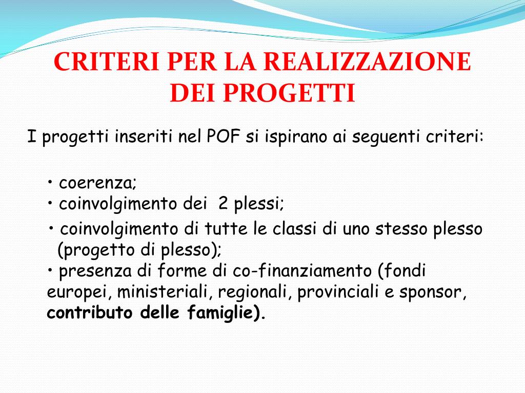 CRITERI PER LA REALIZZAZIONE DEI PROGETTI I progetti inseriti nel POF si ispirano ai seguenti criteri: • coerenza; • coinvolgimento dei 2 plessi; • coinvolgimento di tutte le classi di uno stesso plesso (progetto di plesso);• presenza di forme di co-finanziamento (fondi europei, ministeriali, regionali, provinciali e sponsor, contributo delle famiglie).