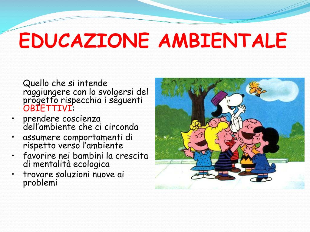 EDUCAZIONE AMBIENTALE • Quello che si intende raggiungere con lo svolgersi del progetto rispecchia i seguenti OBIETTIVI: • prendere coscienza dell’ambiente che ci circonda • assumere comportamenti di rispetto verso l’ambiente • favorire nei bambini la crescita di mentalità ecologica • trovare soluzioni nuove ai problemi
