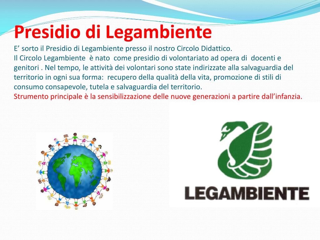 Presidio di LegambienteE’ sorto il Presidio di Legambiente presso il nostro Circolo Didattico.Il Circolo Legambiente è nato come presidio di volontariato ad opera di docenti e genitori . Nel tempo, le attività dei volontari sono state indirizzate alla salvaguardia del territorio in ogni sua forma: recupero della qualità della vita, promozione di stili di consumo consapevole, tutela e salvaguardia del territorio. Strumento principale è la sensibilizzazione delle nuove generazioni a partire dall’infanzia.