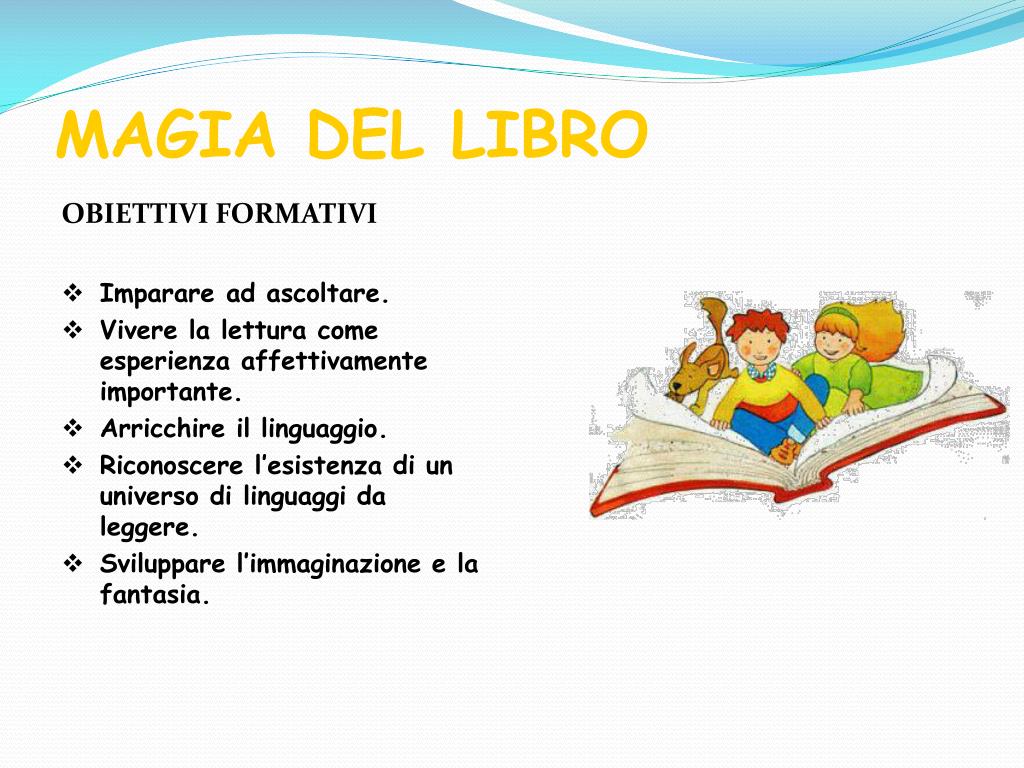MAGIA DEL LIBRO • OBIETTIVI FORMATIVI • Imparare ad ascoltare. • Vivere la lettura come esperienza affettivamente importante. • Arricchire il linguaggio. • Riconoscere l’esistenza di un universo di linguaggi da leggere. • Sviluppare l’immaginazione e la fantasia.