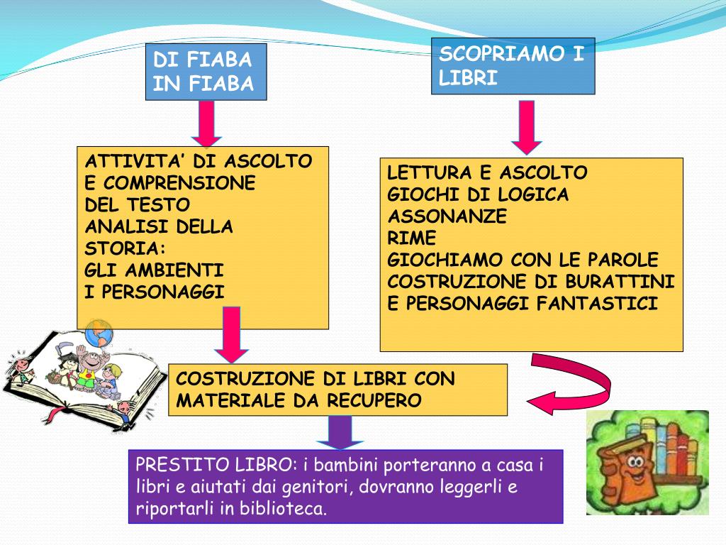 SCOPRIAMO I LIBRI DI FIABA IN FIABA ATTIVITA’ DI ASCOLTO E COMPRENSIONE DEL TESTO ANALISI DELLA STORIA:GLI AMBIENTI I PERSONAGGI LETTURA E ASCOLTOGIOCHI DI LOGICAASSONANZERIMEGIOCHIAMO CON LE PAROLECOSTRUZIONE DI BURATTINI E PERSONAGGI FANTASTICI COSTRUZIONE DI LIBRI CON MATERIALE DA RECUPERO PRESTITO LIBRO: i bambini porteranno a casa i libri e aiutati dai genitori, dovranno leggerli e riportarli in biblioteca.