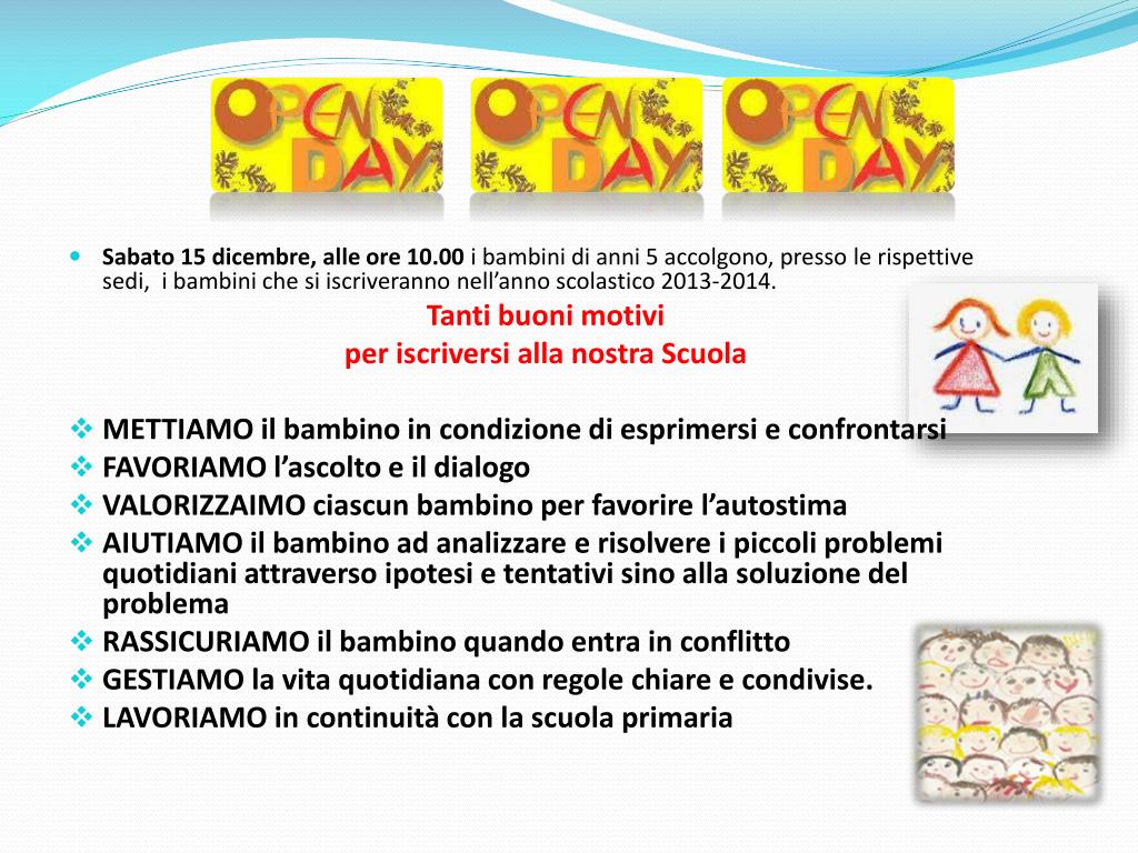 Sabato 15 dicembre, alle ore 10.00 i bambini di anni 5 accolgono, presso le rispettive sedi, i bambini che si iscriveranno nell’anno scolastico 2013-2014. Tanti buoni motivi per iscriversi alla nostra Scuola • METTIAMO il bambino in condizione di esprimersi e confrontarsi • FAVORIAMO l’ascolto e il dialogo • VALORIZZAIMO ciascun bambino per favorire l’autostima • AIUTIAMO il bambino ad analizzare e risolvere i piccoli problemi quotidiani attraverso ipotesi e tentativi sino alla soluzione del problema • RASSICURIAMO il bambino quando entra in conflitto • GESTIAMO la vita quotidiana con regole chiare e condivise. • LAVORIAMO in continuità con la scuola primaria