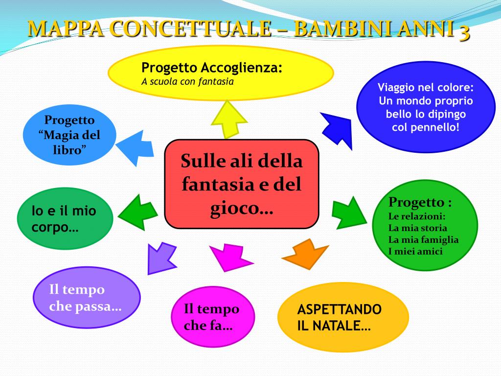 MAPPA CONCETTUALE – BAMBINI ANNI 3 Progetto Accoglienza: A scuola con fantasia Viaggio nel colore: Un mondo proprio bello lo dipingo col pennello! Progetto “Magia del libro” Sulle ali della fantasia e del gioco… Progetto : Le relazioni: La mia storia La mia famiglia I miei amici Io e il mio corpo… Il tempo che passa… ASPETTANDO IL NATALE… Il tempo che fa…