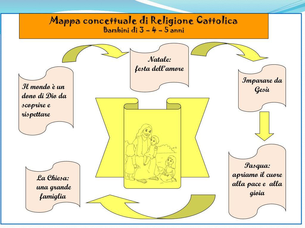 Gesù: amico speciale Natale: festa dell’amore Imparare da Gesù Il mondo è un dono di Dio da scoprire e rispettare Pasqua: apriamo il cuore alla pace e alla gioia La Chiesa: una grande famiglia Mappa concettuale di Religione Cattolica Bambini di 3 – 4 – 5 anni