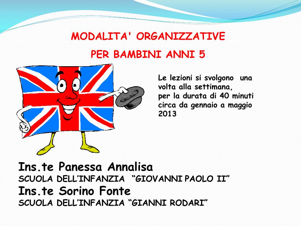 PROGETTO INGLESE Il progetto sperimentale di insegnamento della lingua inglese nella Scuola dell'Infanzia, si fonda sulla consapevolezza che oggi, tutti i bambini europei, ormai inseriti in un contesto socio-culturale multietnico, debbano essere messi nelle condizioni di stabilire tra loro rapporti di positiva convivenza, attraverso un'educazione alla multiculturalità, ovvero alla conoscenza, comprensione e rispetto di usi, costumi, culture e lingue diverse dalla propria.Se si considera che la lingua è per eccellenza l'acceso privilegiato alla cultura di un popolo, allora siamo convinti che la scuola dell’Infanzia in un percorso formativo continuo e unitario, deve dare il suo contributo alla formazione del cittadino d'Europa, impegnandosi sin dalla scuola dell'infanzia in un lavoro di sensibilizzazione e familiarizzazione ai suoni e alla cultura straniera di riferimento.La nostra scuola ormai da più anni si è attivata in tal senso e anche per l'anno scolastico 2012/2013 ha progettato l'interazione didattica con una docente specialista di lingua straniera presso le due scuole dell'infanzia “Giovanni Paolo II“ e “Gianni Rodari". FINALITA' DEL PROGETTO Approccio alla lingua inglese come mezzo di comunicazione per interagire con il mondo circostante.