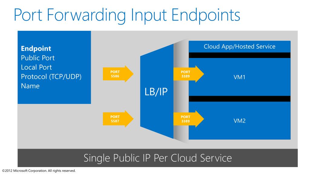 Port Forwarding Input Endpoints Endpoint Public Port Local Port Protocol (TCP/UDP) Name Cloud App/Hosted Service VM1 PORT 5586 PORT 3389 LB/IP VM2 PORT 5587 PORT 3389 Single Public IP Per Cloud Service