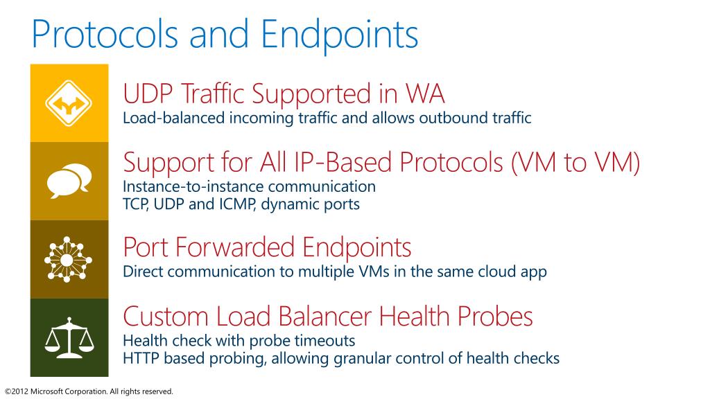 Protocols and Endpoints UDP Traffic Supported in WA Load-balanced incoming traffic and allows outbound traffic Support for All IP-Based Protocols (VM to VM) Instance-to-instance communication TCP, UDP and ICMP, dynamic ports Port Forwarded Endpoints Direct communication to multiple VMs in the same cloud app Custom Load Balancer Health Probes Health check with probe timeouts HTTP based probing, allowing granular control of health checks